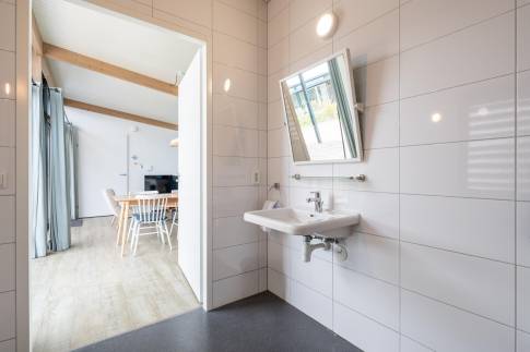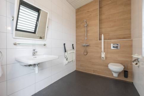 De badkamer is volledig aangepast en voorzien van een vlakke inloopdouche met inklapbare douchestoel, wastafel en toilet met beugels, wat zorgt voor optimaal gebruiksgemak en veiligheid.