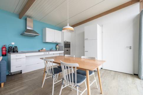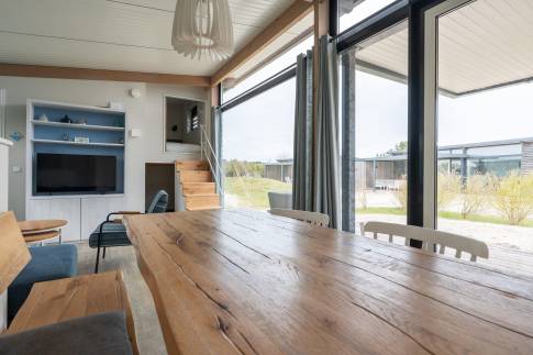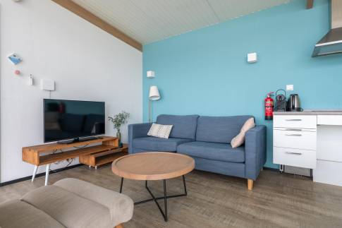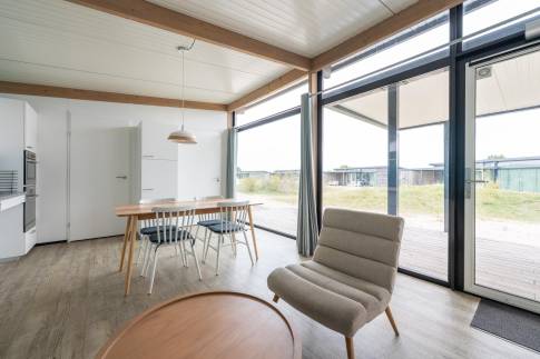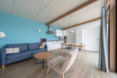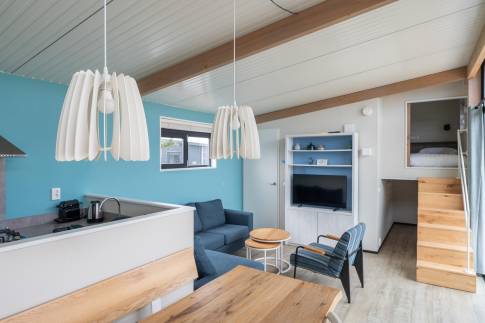 De woning is volledig gelijkvloers en voorzien van vloerverwarming en wifi. De woonkamer beschikt over een gezellige zithoek, eethoek en televisie en staat in open verbinding met de keuken. De keuken is in hoogte verstelbaar en compleet uitgerust met onder andere een vaatwasser, combimagnetron, koelkast met vriesvak, koffiecupapparaat en waterkoker.