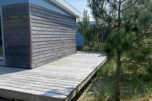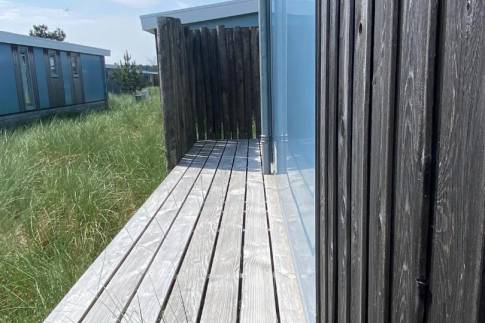 Het strandchalet is verder voorzien van een gemeubileerd terras, dat kan worden beschouwd als een uitgebreid terras met ruimte voor zowel zonovergoten plekken als schaduwrijke plekjes. Bovendien wordt het terras omringd door riet en bomen. Hoewel deze momenteel zijn gesnoeid, zal hun groei in de zomer zeker voor meer privacy zorgen.