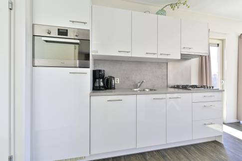 De gezellige woonkamer is ingericht met een comfortabele zithoek en een aparte eethoek. De open keuken is compleet uitgerust met onder meer een combimagnetron, vaatwasser en koffiezetapparaat – ideaal voor een ontspannen verblijf.