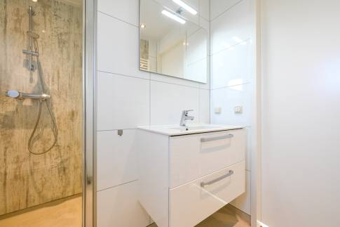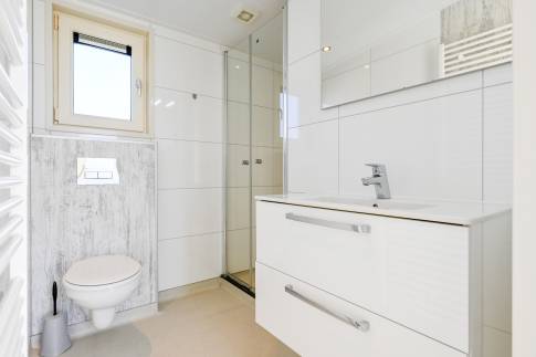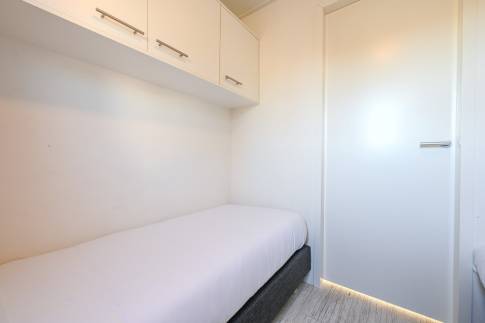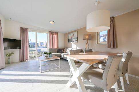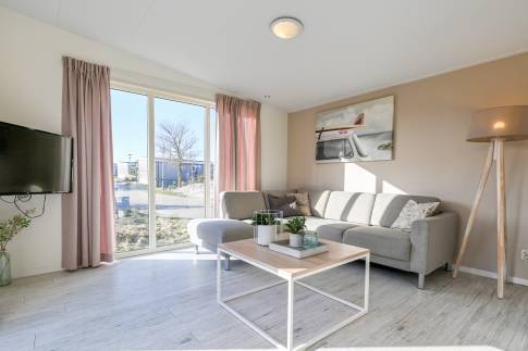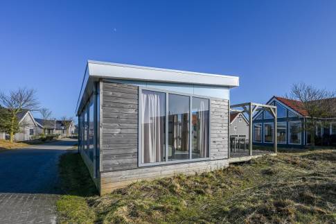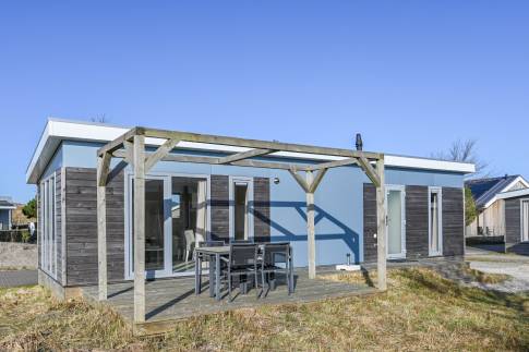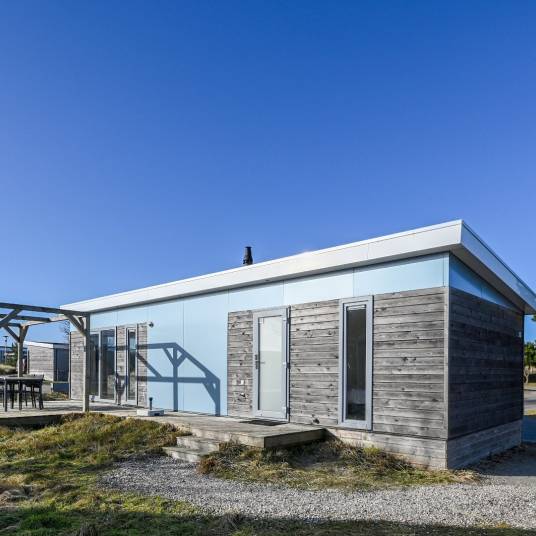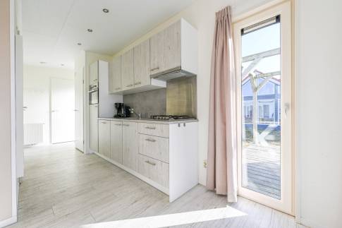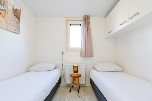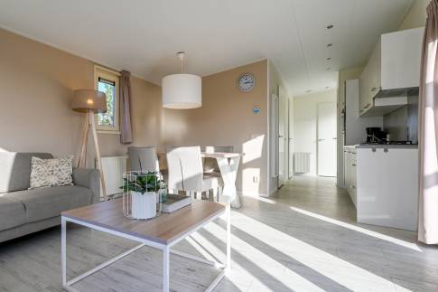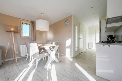 De lichte woonkamer beschikt over een gezellige eethoek, en de moderne keuken is voorzien van een combimagnetron, vaatwasser en koffiezetapparaat. Het chalet beschikt over twee comfortabele slaapkamers, beide uitgerust met twee eenpersoons boxspringbedden. De badkamer is compleet met een douche en toilet.