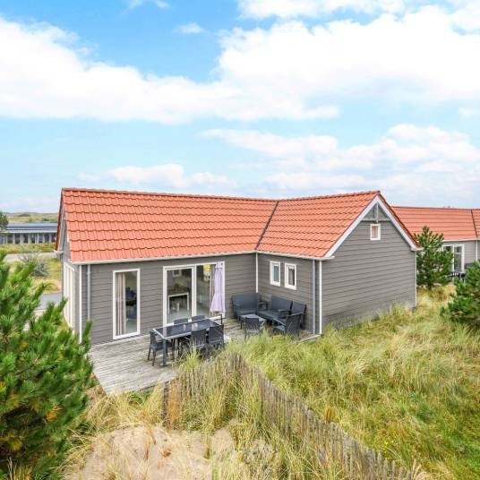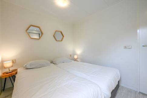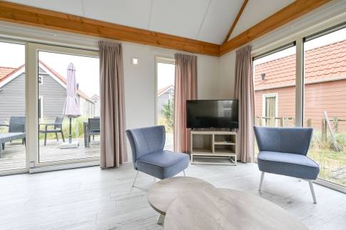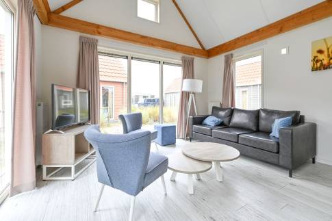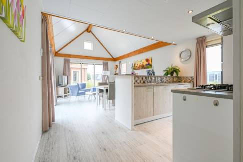 Deze gelijkvloerse lodge biedt plaats aan 6 personen en beschikt over een woonkamer en 3 slaapkamers. In 1 slaapkamer staat een stapelbed, de andere 2 slaapkamers hebben elk 2 eenpersoonsbedden.