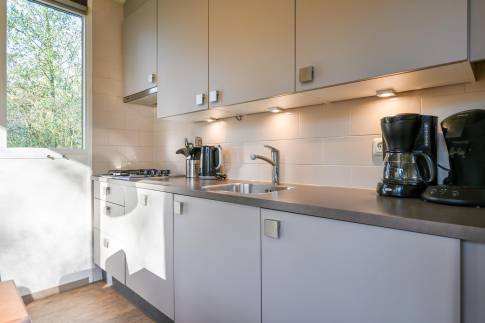 In de woonkamer geniet je van een moderne zithoek met een stijlvolle eethoek en een sfeervolle open haard, perfect voor ontspannen avonden. De open keuken is volledig uitgerust met diverse inbouwapparatuur, waaronder een combimagnetron, vaatwasser en een Senseo koffiezetapparaat.
