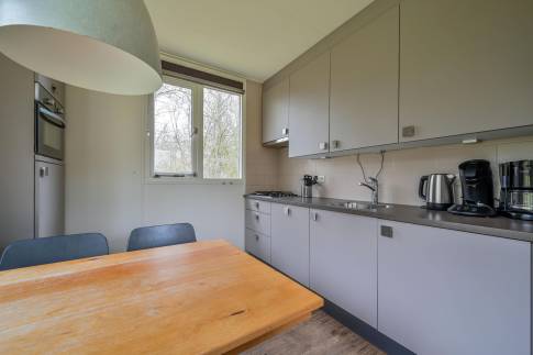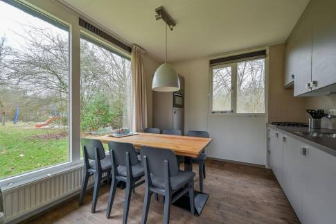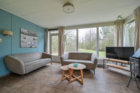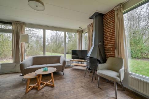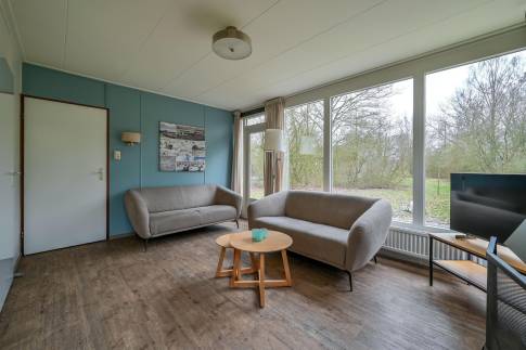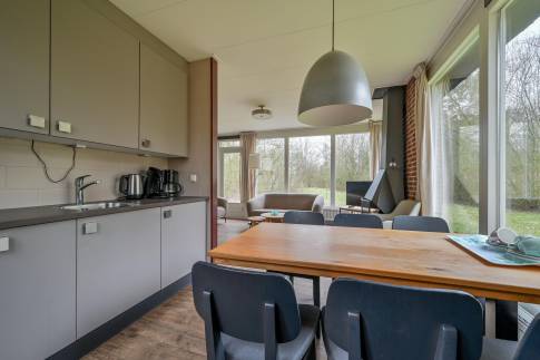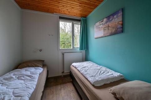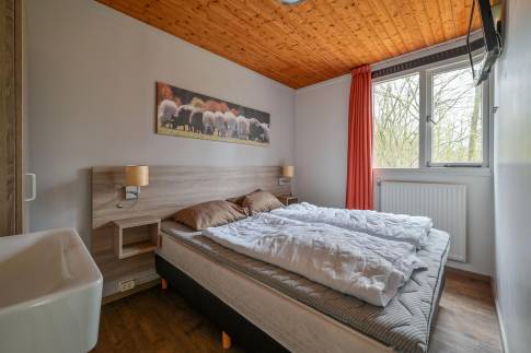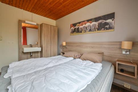 Deze vrijstaande recreatiewoning (type 6C), gelegen aan de rand van het park, geschikt voor maximaal zes personen. Dankzij de grote raampartijen is de woning aangenaam licht, terwijl de indeling zorgt voor een warme en sfeervolle uitstraling. De woonkamer beschikt over een moderne zit- en eethoek en is voorzien van een open haard. De open keuken is compleet uitgerust met diverse inbouwapparatuur, waaronder een combimagnetron, vaatwasser en Senseo koffiezetapparaat. De woning heeft drie slaapkamers, elk ingericht met twee 1-persoons boxspringbedden. De master bedroom is extra comfortabel uitgevoerd met een softtopper, wastafel en flatscreen-tv. De badkamer is in oktober 2023 vernieuwd en beschikt over een douche en wastafelmeubel. Het toilet is separaat.
