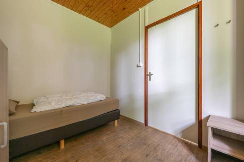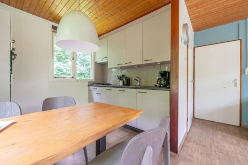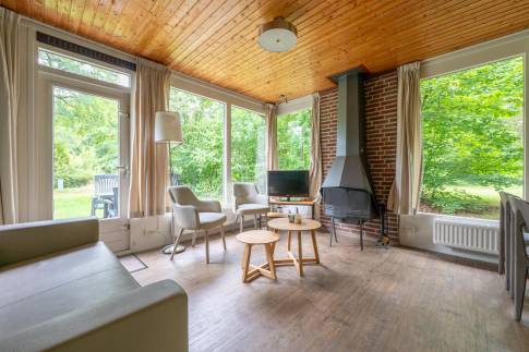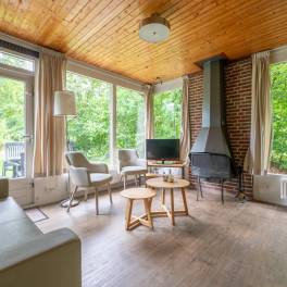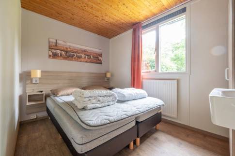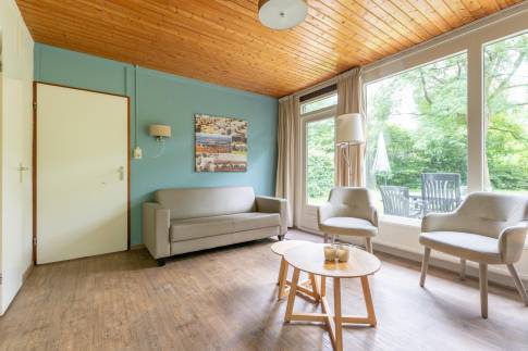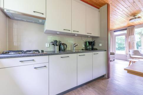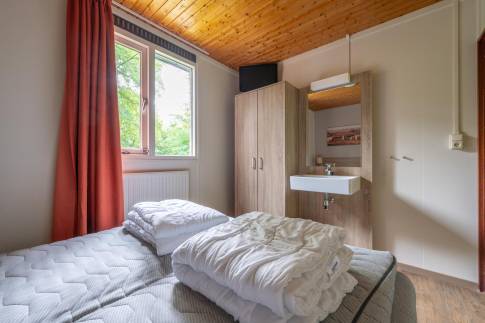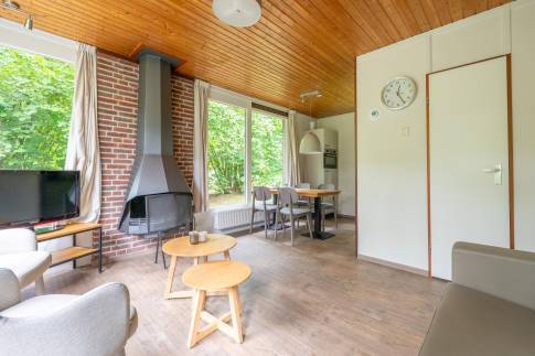 Deze gelijkvloerse, geschakelde recreatiewoning (type 4C) is geschikt voor 4 personen en ligt op een rustige plek aan de rand van het park. De woonkamer is sfeervol ingericht met een moderne zithoek, eettafel en een gezellige open haard. Via de openslaande deuren bereikt u het zonnige terras, voorzien van tuinmeubilair en omgeven door groen voor optimale privacy. De open keuken is volledig uitgerust met diverse inbouwapparatuur, waaronder een vaatwasser, combimagnetron en Senseo koffiezetapparaat. De woning beschikt over twee slaapkamers met eenpersoons boxsprings, waarvan één slaapkamer is voorzien van een eigen wastafel en flatscreen-tv. De badkamer is uitgerust met een ligbad en wastafel, en er is een apart toilet aanwezig. Tot slot is er een praktische inpandige berging – handig voor fietsen, koffers of extra spullen.