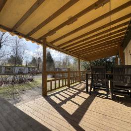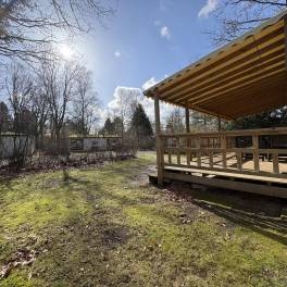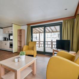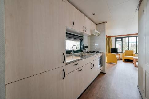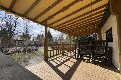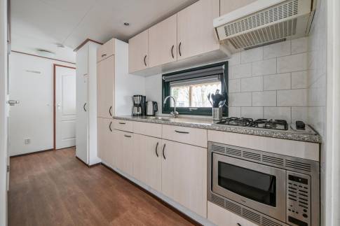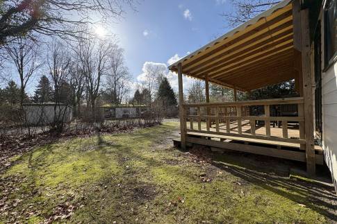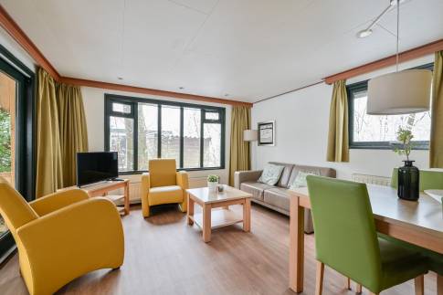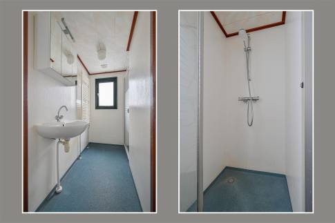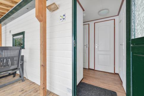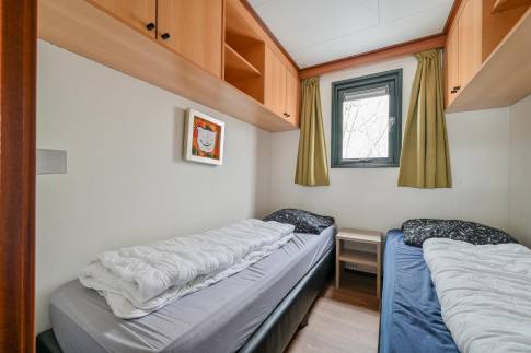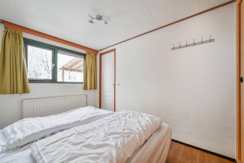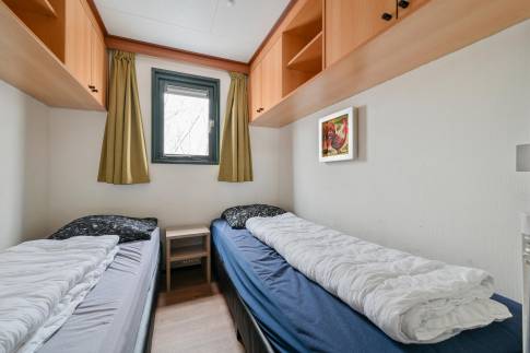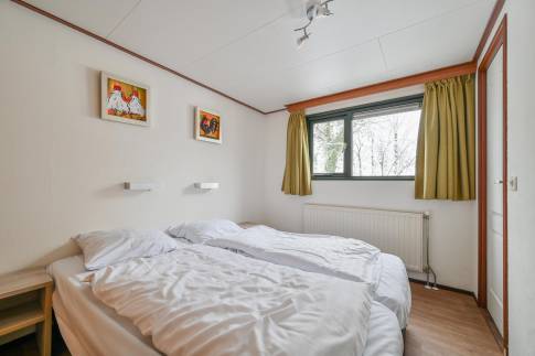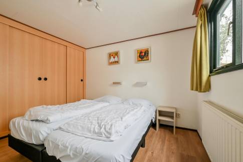 Dit vrijstaande chalet is gelegen op een royaal perceel eigen grond en biedt je volop privacy en rust. Tegelijkertijd bevindt het parkcentrum zich op slechts één minuut loopafstand – een ideale combinatie van natuur en gemak. De woonkamer beschikt over een sfeervolle zithoek, een eethoek en een flatscreen televisie. De open keuken is uitgerust met diverse (inbouw)apparatuur, waaronder een combi magnetron, koelkast met vriesvak, filterkoffiezetapparaat en een 4-pits gaskookplaat. Via openslaande deuren bereik je de ruime, gemeubileerde veranda waar je in alle rust kunt genieten van de groene omgeving. De woning telt twee slaapkamers, beide ingericht met twee eenpersoons boxspringbedden. De badkamer is voorzien van een douche en wastafel. Het toilet is separaat.