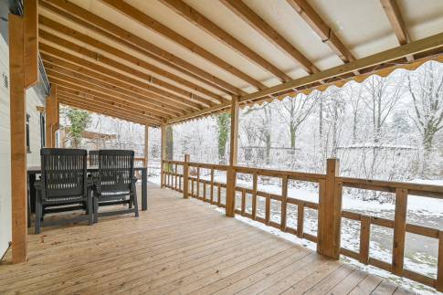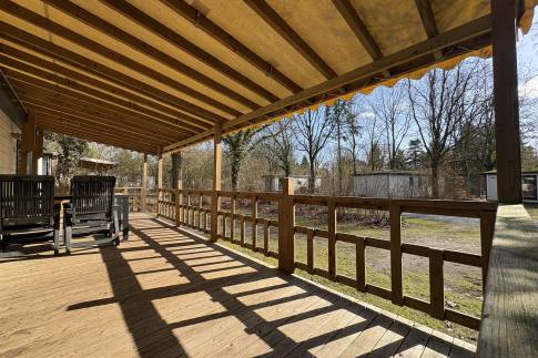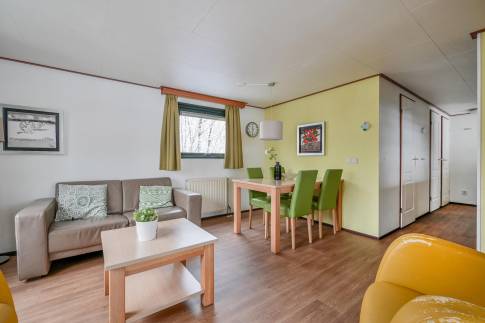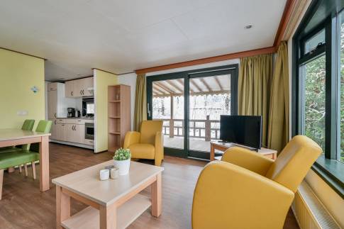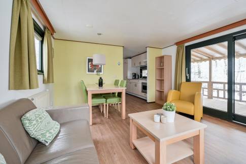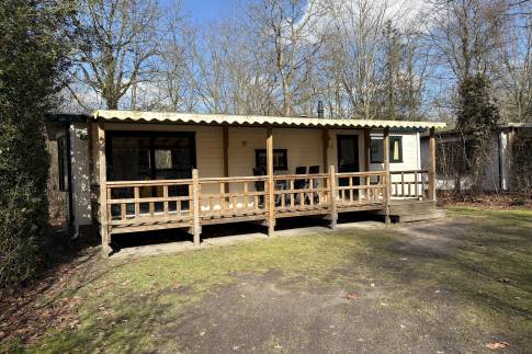 Vrijstaand 4-persoons chalet met veranda, midden in het groen.