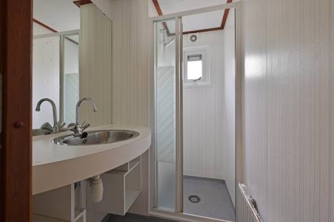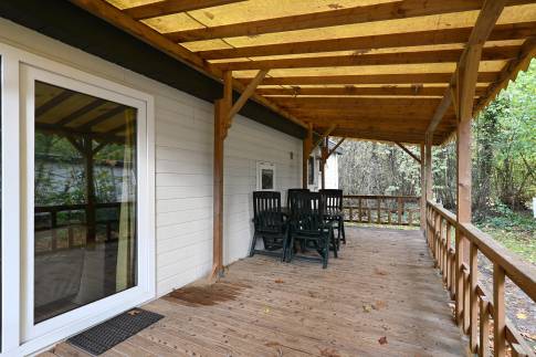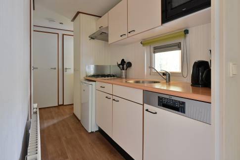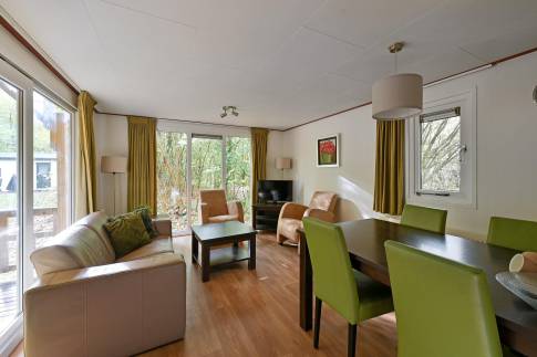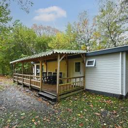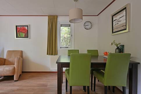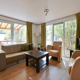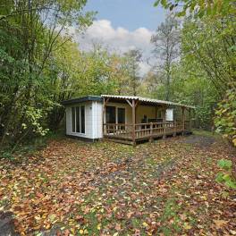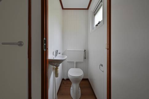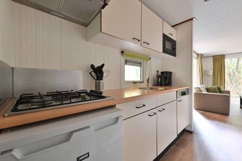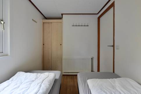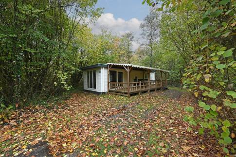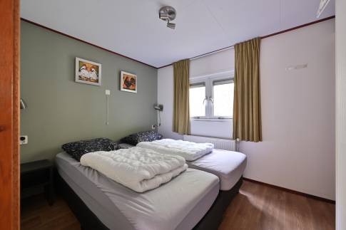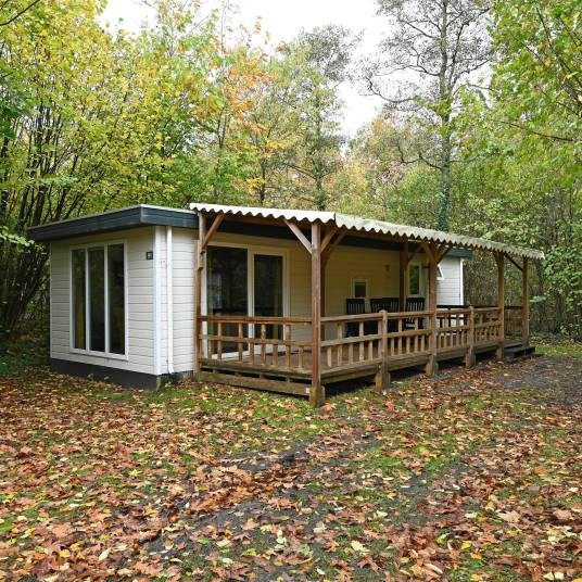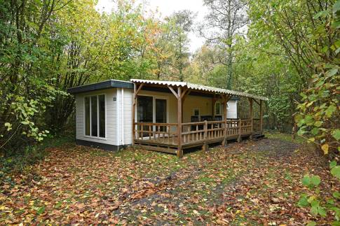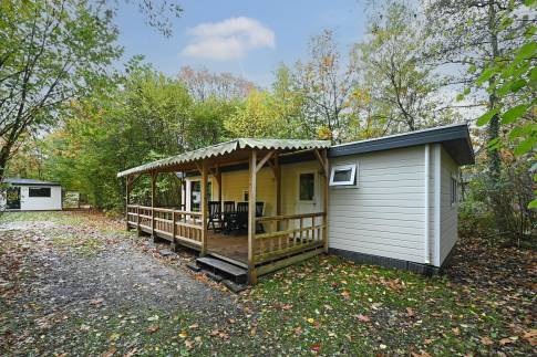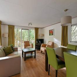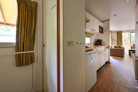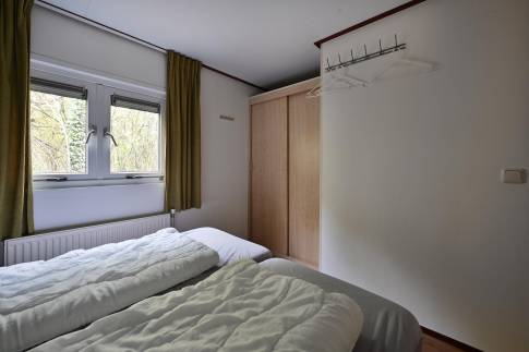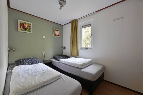 Dit gezellige chalet ligt op een ruim eigen perceel eigen grond en heeft een rustige ligging. Binnen is de woonkamer licht en sfeervol ingericht met een comfortabele zithoek, eethoek en flatscreen-tv. De open keuken is praktisch en voorzien van een magnetron, vaatwasser, koelkast met vriesvak, koffiezetapparaat en een 4-pits gaskookplaat. Via de openslaande deuren bereik je een royale, overdekte veranda met tuinmeubilair – een heerlijke plek om buiten te zitten en te genieten van de groene omgeving. Het chalet beschikt over twee slaapkamers: één met twee eenpersoons boxspringbedden en één met twee losse bedden. De badkamer heeft een douche en wastafel, en er is een apart toilet. Daarnaast is er een handige berging aanwezig, ideaal voor het opbergen van fietsen of tuinspullen.