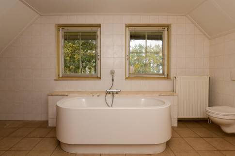 De badkamer op de begane grond is voorzien van een bubbelbad, douchecabine en wastafel. De badkamer op de eerste verdieping beschikt over een ligbad, douchecabine, sauna, wastafel en toilet. Er is daarnaast een separaat toilet en een inpandige berging op de begane grond aanwezig.