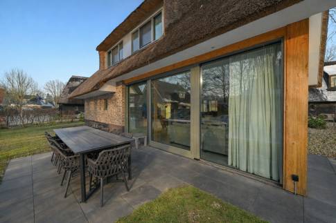 Via de openslaande deuren in de woonkamer loop je zo het terras op, dat is ingericht met meubilair voor 10 personen.