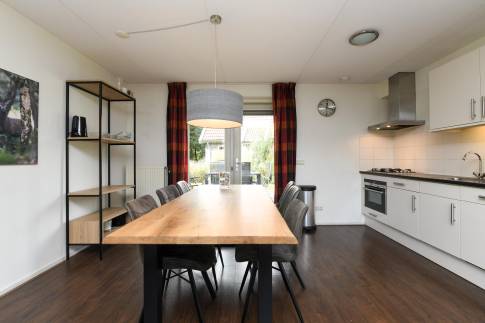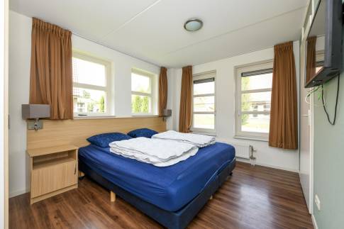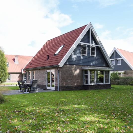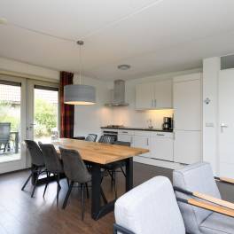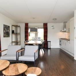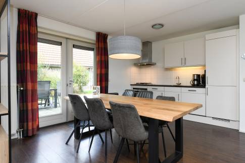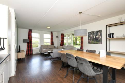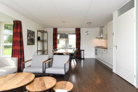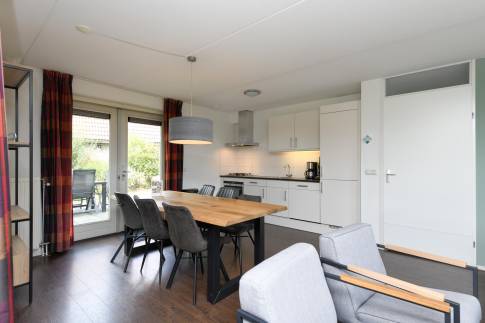 De 6-persoons vrijstaande recreatiewoning, type 6C2, ligt op een zonnige plek aan de rand van het park vlakbij de centrale voorzieningen. De woning beschikt over een lichte woonkamer met open keuken, voorzien van inbouwapparatuur zoals een vaatwasser, combimagnetron en koffiezetapparaat. Vanuit de woonkamer heb je via de openslaande deuren toegang tot het terras en de ruime tuin.