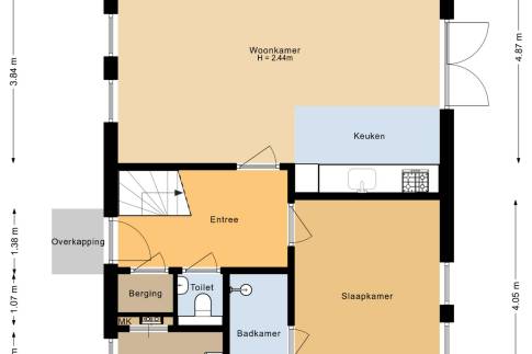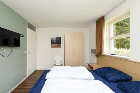 Op de begane grond bevindt zich de hoofdslaapkamer, voorzien van twee boxspringbedden en een flatscreen-tv. Vanuit deze kamer heb je direct toegang tot de badkamer met douche en wastafel. Daarnaast is er op de begane grond een separaat toilet aanwezig.