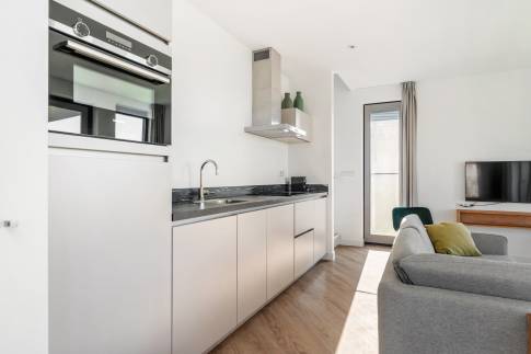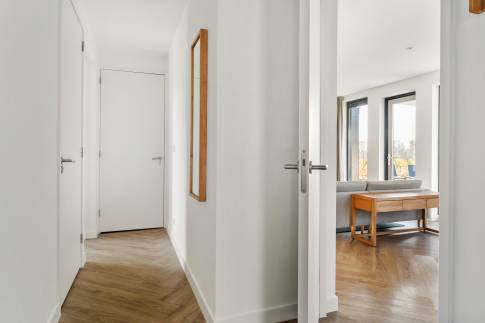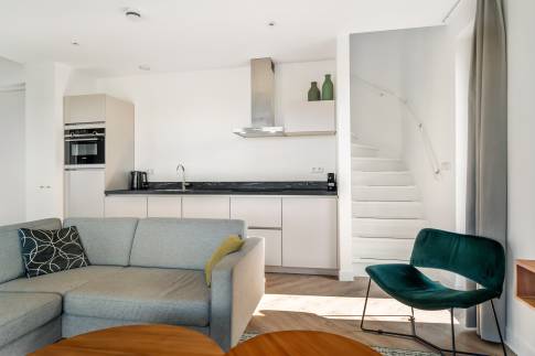 De open keuken is luxe en neutraal uitgevoerd, voorzien van inbouwapparatuur zoals een vaatwasser, combimagnetron en inductiekookplaat.