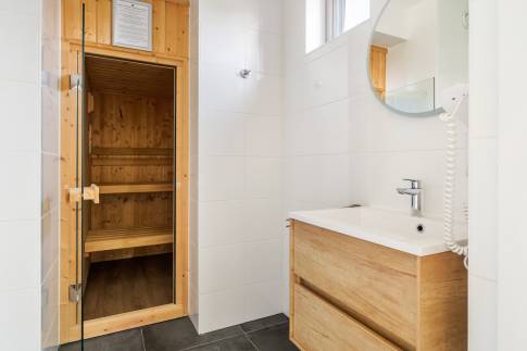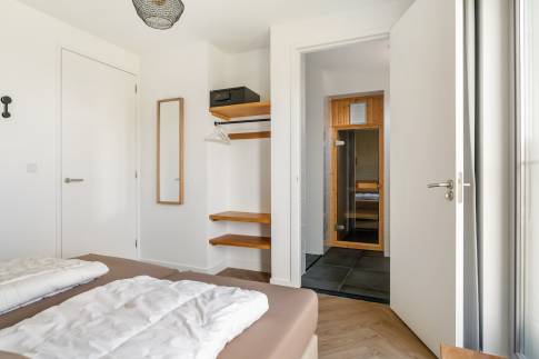 Op de begane grond bevindt zich een slaapkamer met een comfortabel boxspringbed en televisie. De ensuite badkamer is voorzien van een douche, separaat toilet en een luxe sauna, waar je heerlijk kunt ontspannen na een drukke dag. Daarnaast is er een inpandige berging met was-droogcombinatie en extra kastruimte onder de trap.