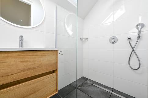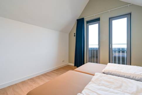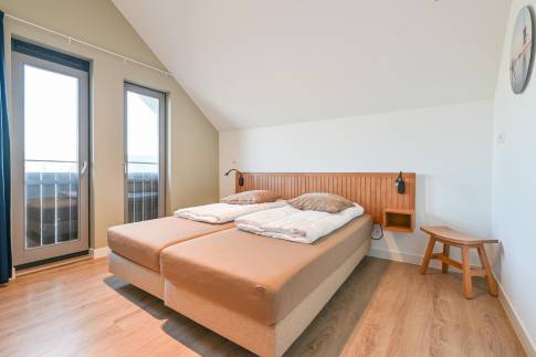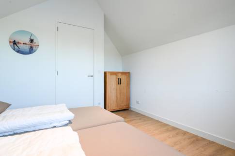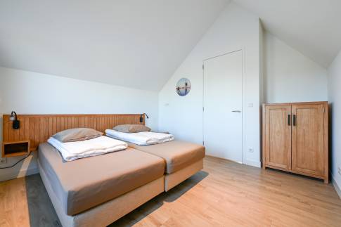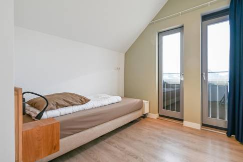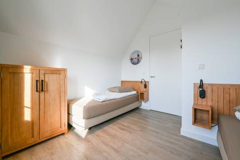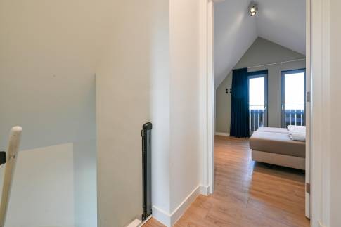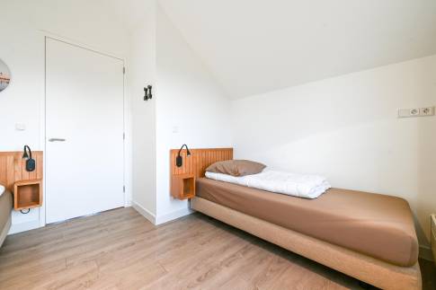 Op de bovenverdieping bevinden zich nog twee sfeervolle slaapkamers, beide voorzien van een comfortabele boxspring. Op de verdieping is ook een separate, royale badkamer met een douche, dubbele wastafel en toilet.