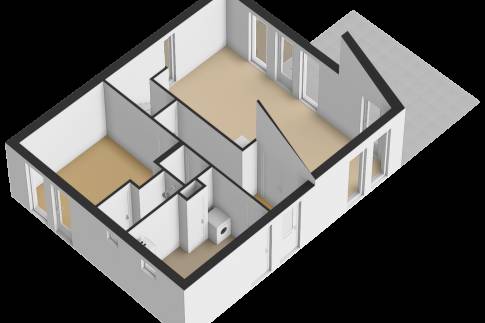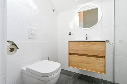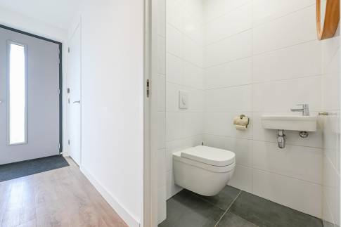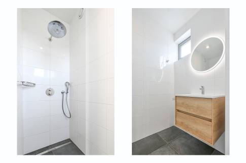 Op de begane grond bevindt zich een ruime slaapkamer met een comfortabele boxspring met televisie. Hier bevindt zich ook een moderne badkamer met regendouche. Een separaat toilet, een functionele inpandige berging met was- droogcombinatie en de extra kastruimte onder de trap maakt dat iedere plek in de woning optimaal wordt benut.