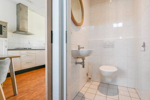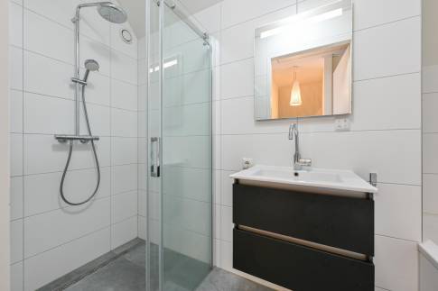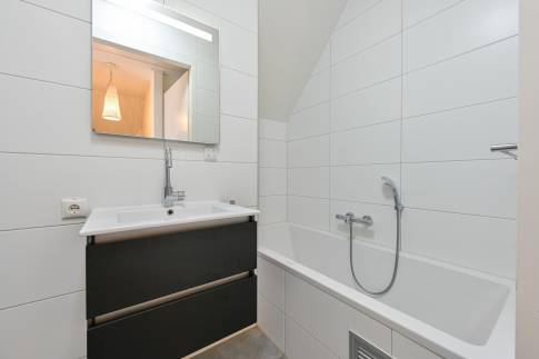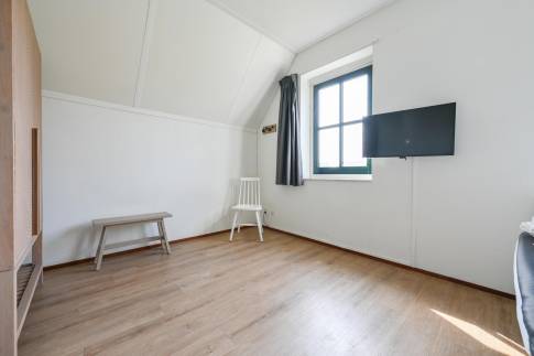 Op de verdieping bevinden zich twee ruime slaapkamers, beide voorzien van comfortabele boxsprings, waarvan één met tv-aansluiting. Daarnaast is er een praktische badkamer met een ligbad, wastafelmeubel en een inloopdouche (infrarood sunshower). Het toilet is gescheiden, zowel op de begane grond als op de verdieping.