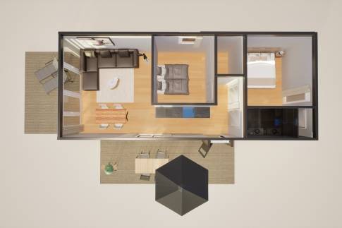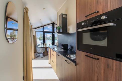 De badkamer is uitgerust met een toilet, wastafel en een inloopdouche. De open keuken is volledig voorzien van moderne inbouwapparatuur, waardoor het bereiden van heerlijke maaltijden een plezier wordt. Of je nu een snel ontbijt bereidt voordat je op avontuur gaat of een uitgebreid diner klaarmaakt, de keuken biedt alles wat je nodig hebt.