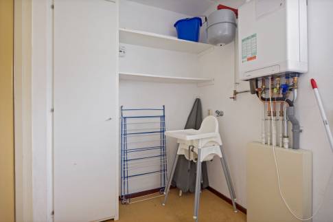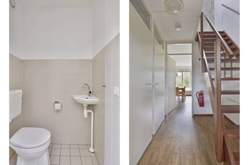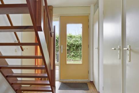De woonkamer heeft een zit- en eethoek. Via de openslaande deuren in de woonkamer kom je bij het terras. Op de begane grond ligt een parketvloer en op de bovenverdieping ligt vloerbedekking. De open keuken beschikt onder andere over een vaatwasser en een combimagnetron.