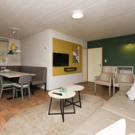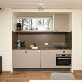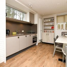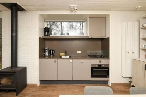 De woonkamer is een gezellige en comfortabele ruimte om samen te ontspannen. Er is een zithoek, een eethoek en een sfeervolle houtkachel voor extra warmte en gezelligheid. De open keuken is uitgerust met moderne inbouwapparatuur en biedt alle gemakken voor een prettig verblijf, waaronder een vaatwasser, combimagnetron en Senseo koffiezetapparaat.