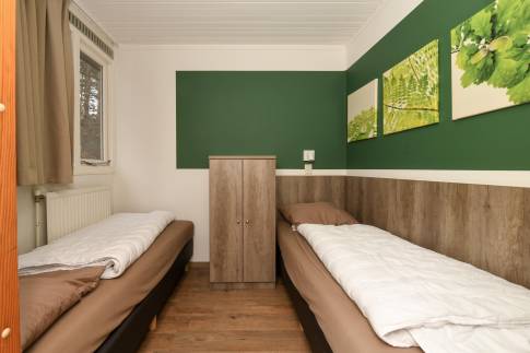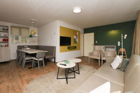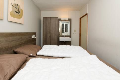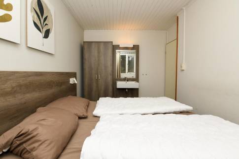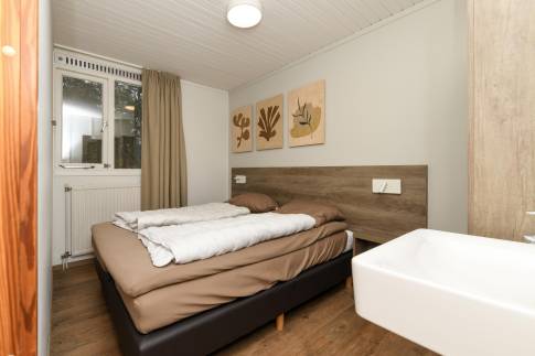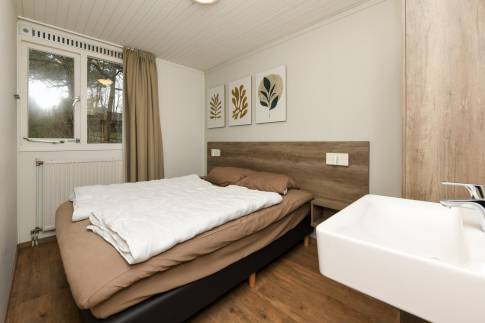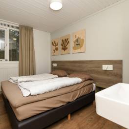 Vlak bij de wandeluitgang, ligt deze 8-persoons recreatiewoning (type 8C) op een zonnige, rustige plek. Dichtbij is een speelpunt voor de kleinste bezoekers. U betreedt de woning via de hal, die toegang biedt tot vier slaapkamers. Alle slaapkamers zijn uitgerust met comfortabele boxsprings, en in de twee grootste kamers is daarnaast een wastafel aanwezig. Tegenover de slaapkamers bevinden zich de badkamer en een apart toilet. De badkamer is voorzien van een wastafelmeubel, een inloopdouche en een ligbad.