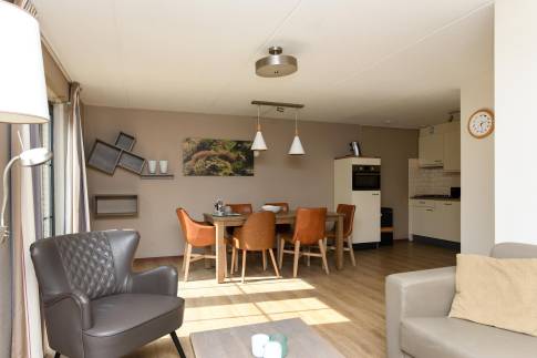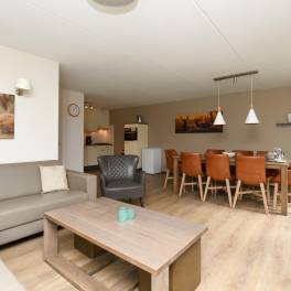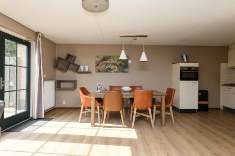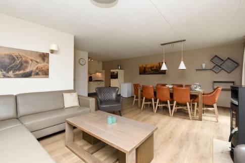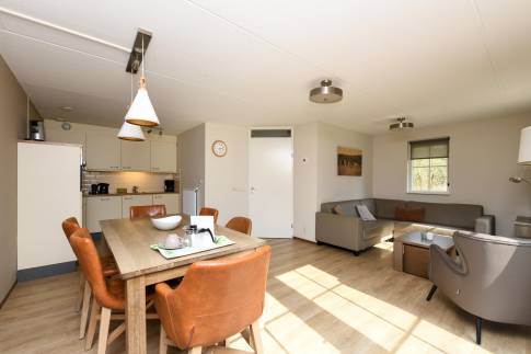 Woning 324: Deze comfortabele 6-persoonswoning, type 6LT1, biedt alles voor een ontspannen verblijf. De woonkamer is smaakvol ingericht met een zit- en eethoek en beschikt over een flatscreen-tv. Via de openslaande deuren bereikt u het terras, waar u in alle rust kunt genieten van het buitenleven dankzij het verstelbare tuinmeubilair.