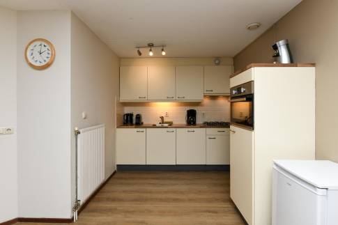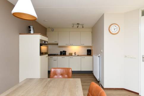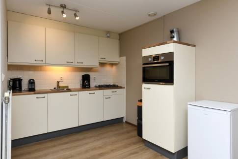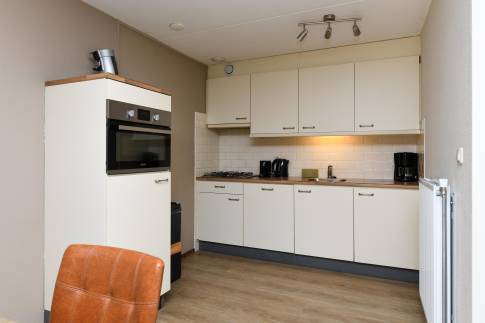 De open keuken is praktisch ingedeeld en compleet uitgerust met onder andere een combimagnetron, vaatwasser, koelkast met vriesvak en een Nespresso koffiemachine.