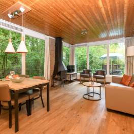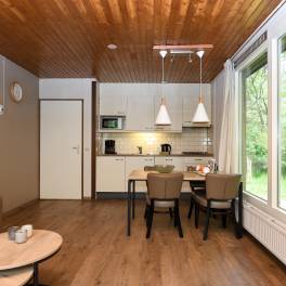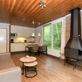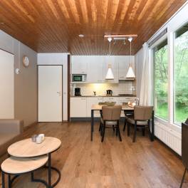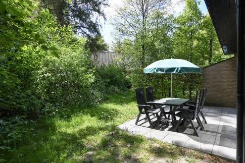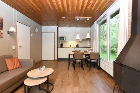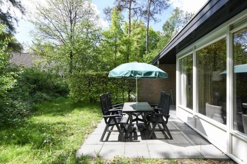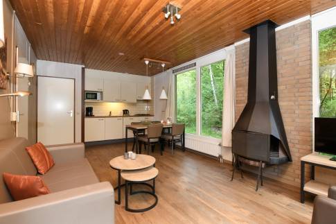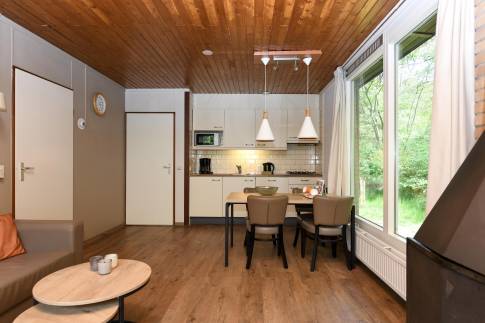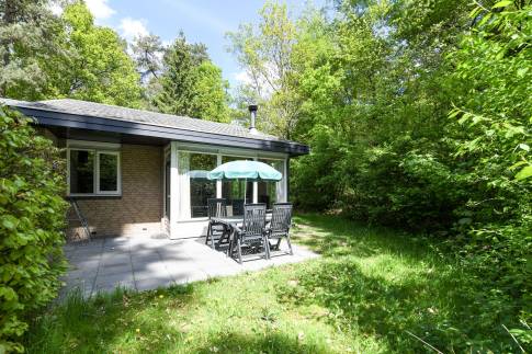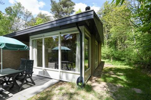 Deze gelijkvloerse, geschakelde recreatiewoning (type 4B) ligt op een rustige locatie, midden in het bos. Vanuit de lichte woonkamer kijkt u zo de natuur in. Buiten bevindt zich een gemeubileerd terras, waar u in alle rust kunt genieten van een kop koffie, omgeven door groen.