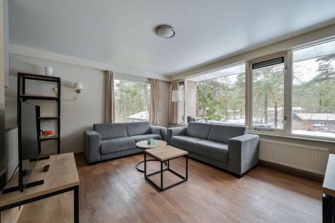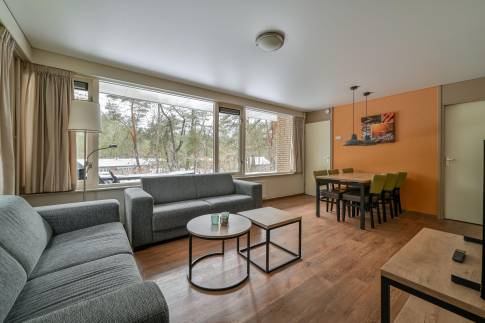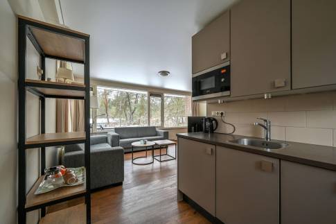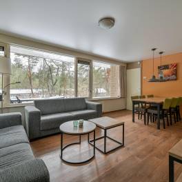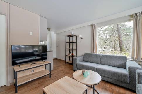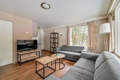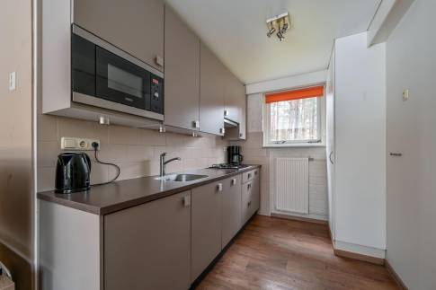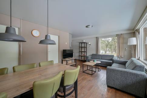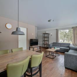 Deze vrijstaande 6-persoons recreatiewoning (type 6B) ligt nabij de centrale faciliteiten van het park. De sfeervolle woonkamer beschikt over een deur naar het gemeubileerde terras. De open keuken is compleet ingericht en voorzien van onder andere een magnetron, vaatwasser en Senseo koffiezetapparaat.