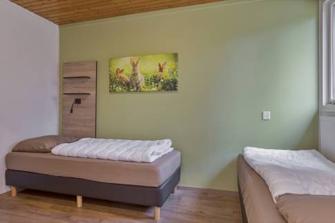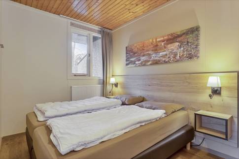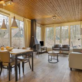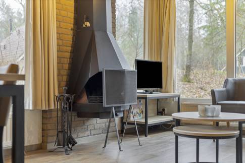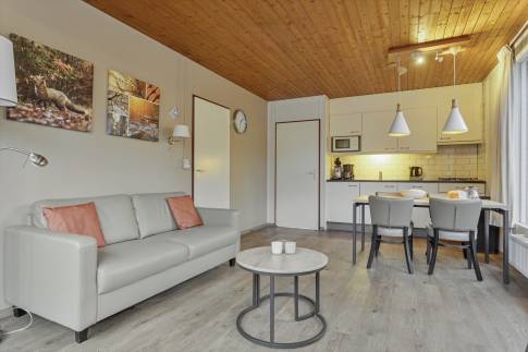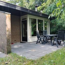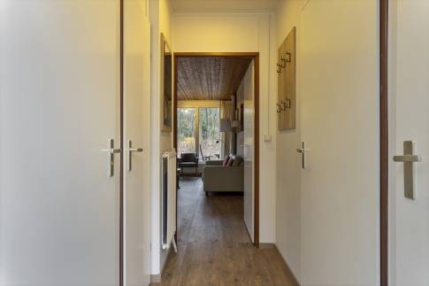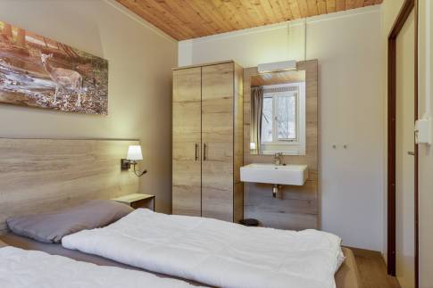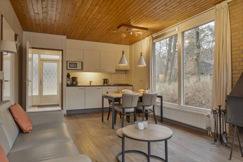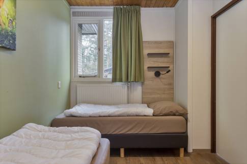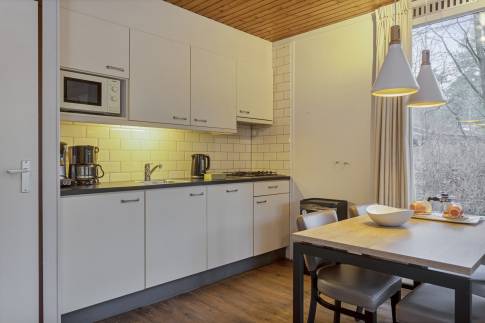 Deze geschakelde recreatiewoning (type 4B) vindt u op een rustig plekje in een bosrijke omgeving. Vanuit de gezellige lichte woonkamer, ziet u buiten regelmatig een konijn of eekhoorn voorbijkomen. Wilt u nog dichter bij de natuur staan? Dan kun u op uw eigen gemeubileerde terras heerlijk van een kopje koffie genieten. De open keuken met eethoek is uitgerust met verschillende (inbouw)apparatuur zoals een vaatwasser, magnetron en koelkast met vriesvak. Daarnaast zijn er een Senseo- en filterkoffiezetapparaat en een 4-pits gaskookplaat aanwezig. Er zijn gelijkvloers twee slaapkamers welke beiden zijn uitgerust met twee 1-persoons boxsprings. Daarnaast heeft één van de slaapkamers ook een wastafel. In de moderne badkamer vindt u een ligbad, toilet en wastafel.