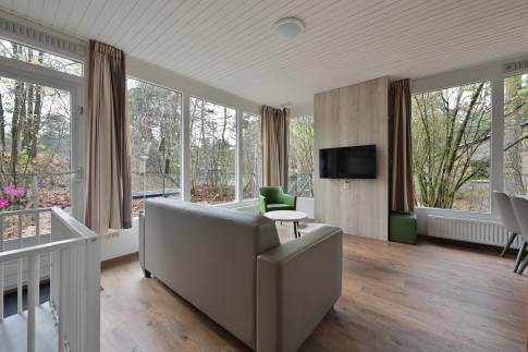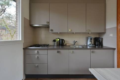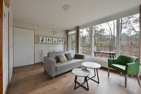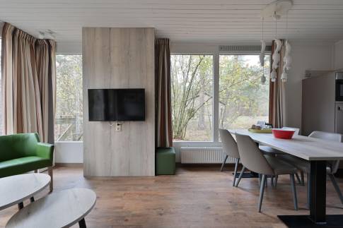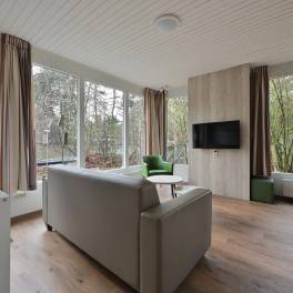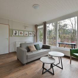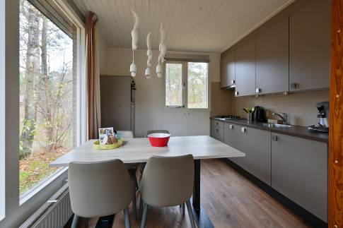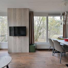 De recreatiewoning (type 4CN, babybungalow) is vrijstaand en omgeven door veel groen, waardoor je veel privacy ervaart. De woonkamer is licht en ruimtelijk, met grote ramen die uitzicht bieden op de natuurlijke omgeving. Het terras grenst direct aan de woonkamer en is voorzien van tuinmeubilair. De keuken is open en praktisch ingericht, met een eethoek en alle benodigde apparatuur, waaronder een vaatwasser, combimagnetron, koelkast met vriesvak, koffiezetapparaat (filter en Senseo) en een 4-pits gaskookplaat.