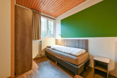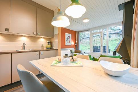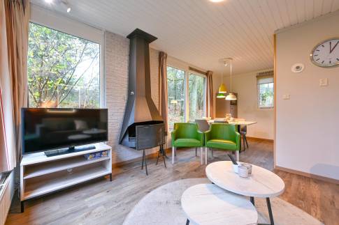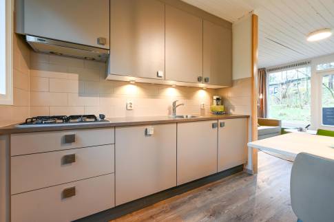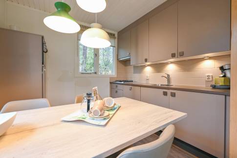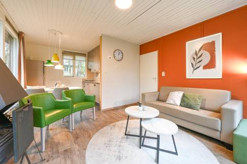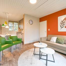Recreatiewoning 640 (type 4C) is een geschakelde woning, gelegen in een natuurlijke omgeving die veel privacy biedt. De sfeervolle woonkamer is voorzien van een comfortabele zithoek, waar u door de grote ramen optimaal kunt genieten van het omringende groen. Vanuit de woonkamer stapt u direct het gemeubileerde terras op.