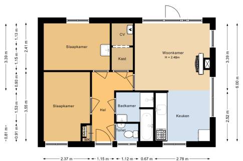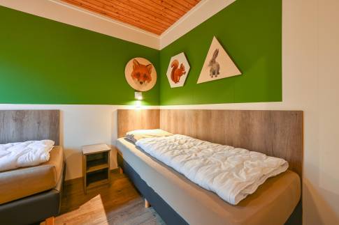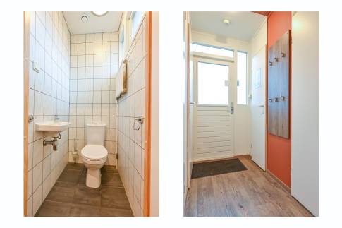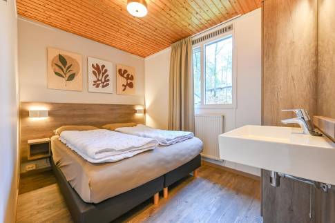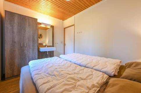 De woning beschikt over twee slaapkamers. De eerste slaapkamer is uitgerust met twee 1-persoons boxsprings, een 2-persoons softtopper en een wastafel. De tweede slaapkamer biedt twee 1-persoons boxsprings. De badkamer beschikt over een douche, ligbad en wastafel. In de hal bevindt zich een apart toilet. Bovendien is er een praktische inpandige berging aanwezig.