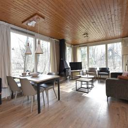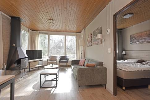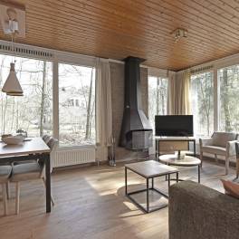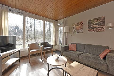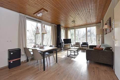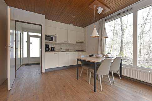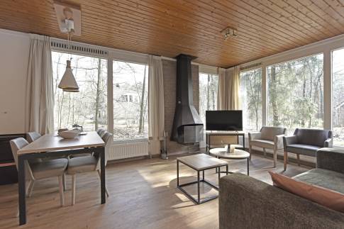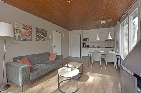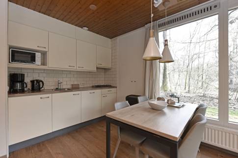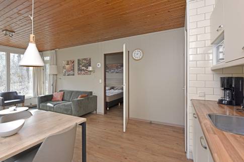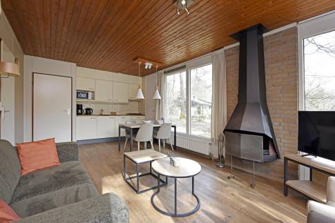 Deze comfortabele 4-persoons recreatiewoning is sfeervol ingericht en van alle gemakken voorzien. De gezellige woon-/eetkamer beschikt over een zithoek, eethoek, flatscreen-tv en een open haard, ideaal voor ontspannen avonden. De open keuken is compleet uitgerust met onder andere een vaatwasser, magnetron, filterkoffiezetapparaat en een 4-pits gasplaat, aangevuld met een standaard keukeninventaris.