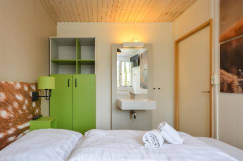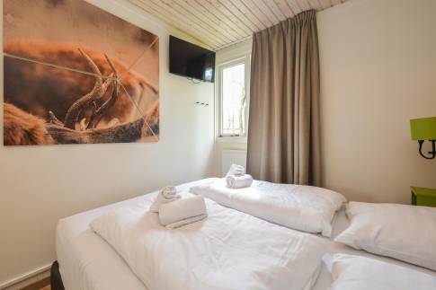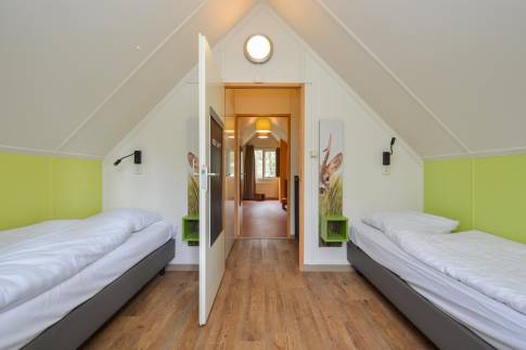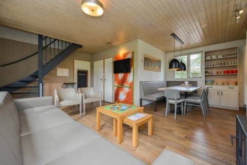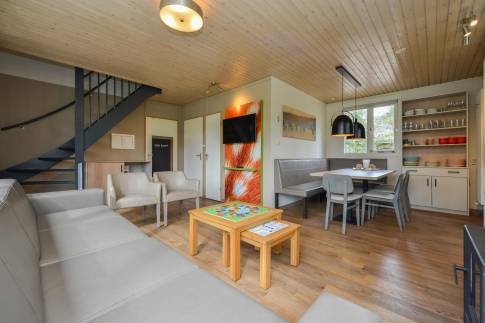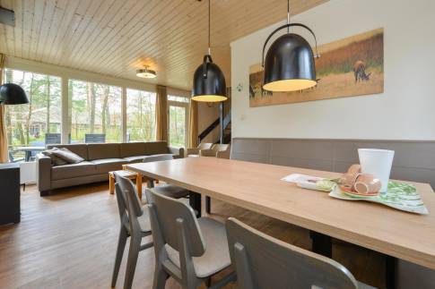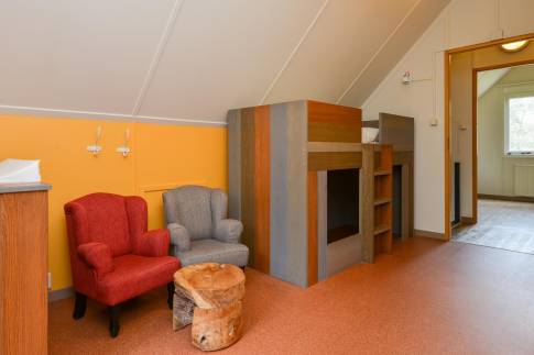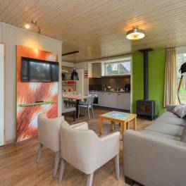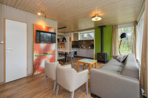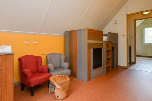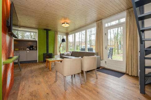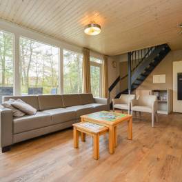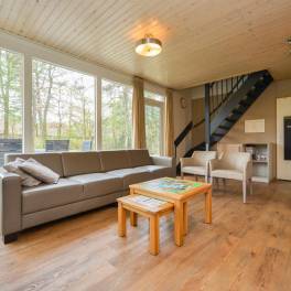 De woonkamer is sfeervol ingericht en heeft een open haard. De grote raampartijen zorgen voor veel lichtinval. Vanuit de woonkamer heeft u via de tuindeur toegang tot het gemeubileerde terras. De keuken met eethoek is van alle gemakken voorzien en beschikt over o.a. een vaatwasser, combimagnetron, 4-pits gaskookplaat, koelkast met vriesvak en een Senseo- en filterkoffiezetapparaat. Op de begane grond zijn twee slaapkamers, waarvan één beschikt over twee 1-persoons boxsprings met 2-persoonssofttopper en wastafel. De tweede slaapkamer beschikt over twee 1-persoons boxsprings. In de badkamer vindt u een douche en wastafel. In de hal is er een separaat toilet aanwezig. Op de verdieping zijn nog twee slaapkamers waarvan één voorzien van twee 1-persoons boxsprings. De andere slaapkamer heeft een stapelbed, ledikant en een 1-persoons boxspringbed.