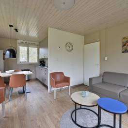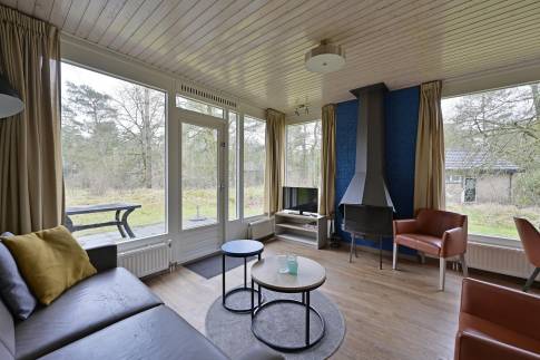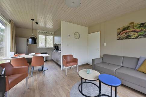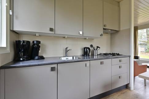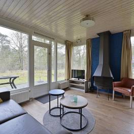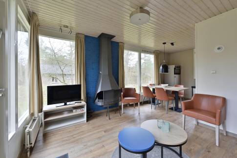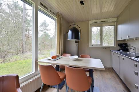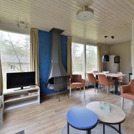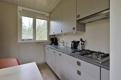 Deze geschakelde 4-persoons recreatiewoning (type 4C) ligt op een rustige locatie aan de rand van het park. De lichte woonkamer is voorzien van een knusse zithoek en een sfeervolle open haard, ideaal voor gezellige avonden. Dankzij de grote ramen heeft u een prachtig uitzicht op de groene omgeving. Via de deur bereikt u het gemeubileerde terras, waar u heerlijk kunt ontspannen in de buitenlucht. De open keuken beschikt over een eethoek en moderne (inbouw)apparatuur, waaronder een vaatwasser, combimagnetron, koelkast met vriesvak, 4-pits gaskookplaat, Senseo- en filterkoffiezetapparaat.