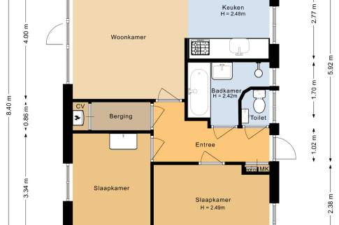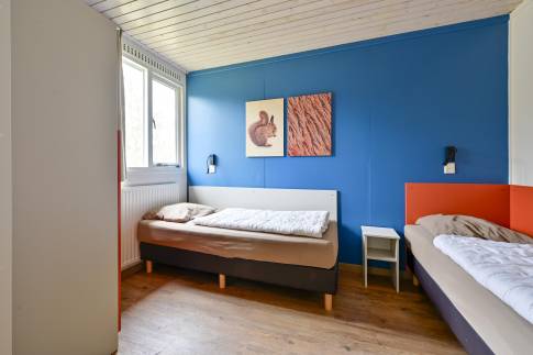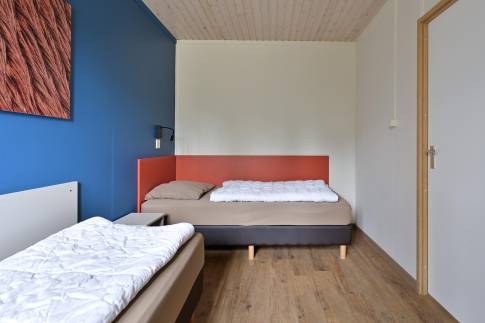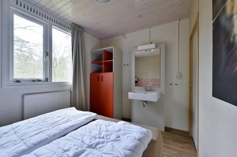 Via de hal bereikt u de twee comfortabele slaapkamers, de badkamer, het separate toilet en de inpandige bergruimte. Eén slaapkamer is voorzien van twee eenpersoons boxsprings met een tweepersoons softtopper en een wastafel. De tweede slaapkamer heeft twee eenpersoons boxsprings. De badkamer is uitgerust met een ligbad, douche en wastafel.