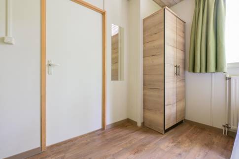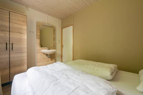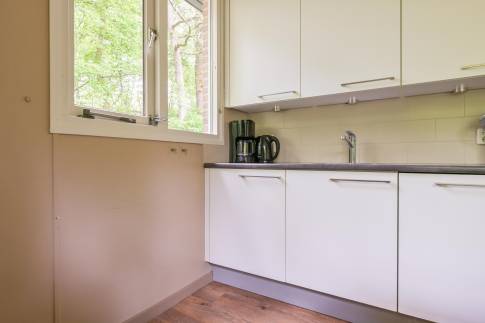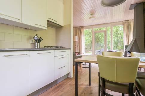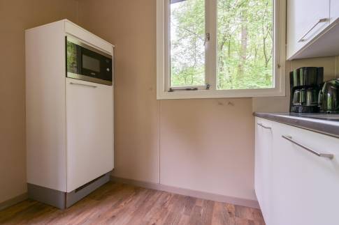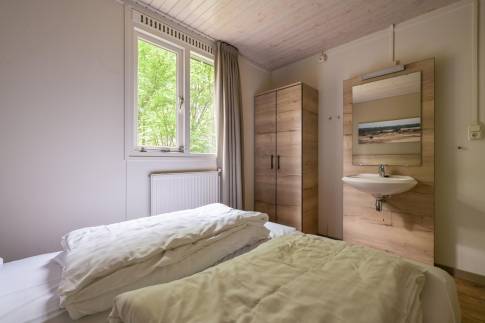Deze vrijstaande recreatiewoning van het type 4B is heerlijk rustig gelegen, midden in het groen. Binnen treft u een gezellige woonkamer met grote ramen die zorgen voor veel natuurlijk licht. Er is een comfortabele zit- en eethoek, een sfeervolle houtkachel en een flatscreen-tv. De open keuken beschikt over diverse inbouwapparatuur, waaronder een koffiezetapparaat, vaatwasser en magnetron. De woning heeft twee slaapkamers, waarvan één met een 2 persoonsboxspring. De andere slaapkamer beschikt over twee enkele bedden. De badkamer is praktisch ingericht en beschikt over zowel een ligbad als een inloopdouche. In de hal bevindt zich het toilet.