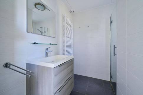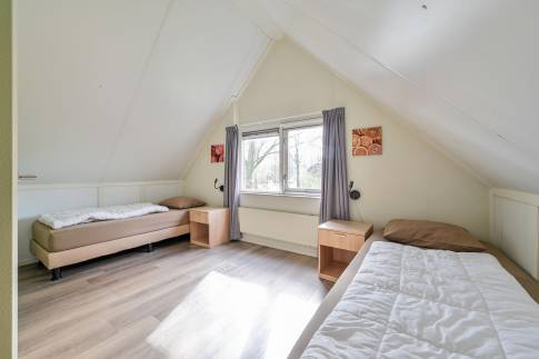 Via de hal bereik je één van de drie slaapkamers, evenals het toilet en de badkamer. De slaapkamer op de begane grond is ingericht met twee 1-persoons boxsprings met een 2-persoons softtopper en een flatscreen tv. De badkamer is voorzien van een ligbad en een wastafelmeubel.