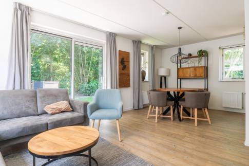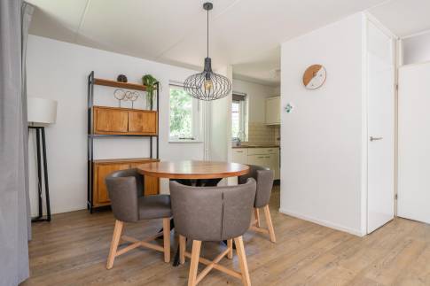 Deze recreatiewoning (type 4L) is gelegen op een ruim perceel. In de lichte woonkamer vindt u een comfortabele zit- en eethoek, met een deur naar het terras voorzien van terrasmeubilair. De tuin is omgeven door groen, waardoor u veel privacy ervaart.