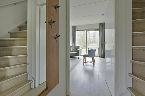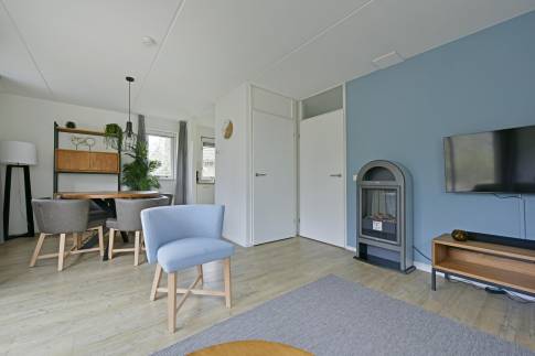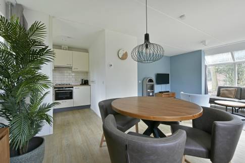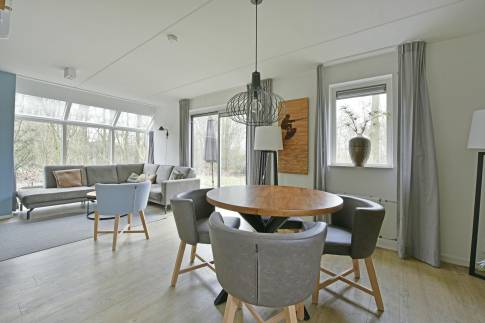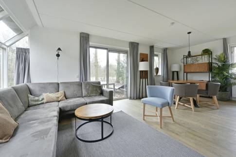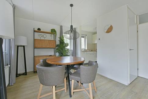 Deze luxe vrijstaande recreatiewoning type 4L staat op een royaal perceel eigen grond. In de lichte woonkamer vind je een comfortabele zit- en eethoek met elektrische sfeerhaard en toegang tot het terras, dat is voorzien van verstelbaar terrasmeubilair en ligbedden. De tuin wordt omringd door groen, waardoor je geniet van volop privacy.