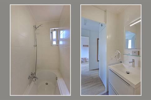De open keuken is volledig uitgerust met onder andere een vaatwasser, combimagnetron en Nespresso-koffiezetapparaat. Op de begane grond bevinden zich een moderne badkamer met douche/bad en wastafel, een separaat toilet en een heerlijke privésauna voor ultieme ontspanning. De woning beschikt over twee slaapkamers. Eén slaapkamer heeft twee eenpersoons boxspringbedden en een flatscreen-tv. De tweede slaapkamer is eveneens voorzien van twee eenpersoons boxspringbedden. Op deze verdieping bevindt zich bovendien een tweede toilet.