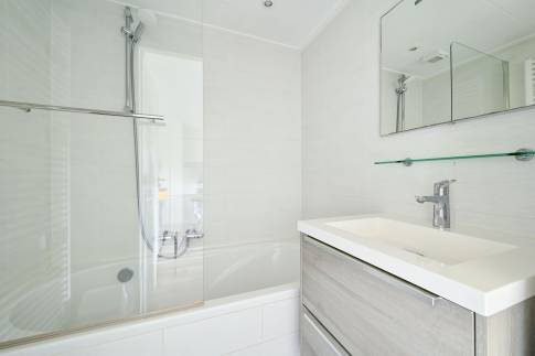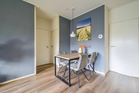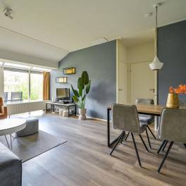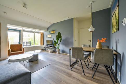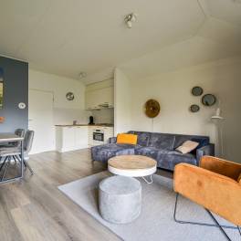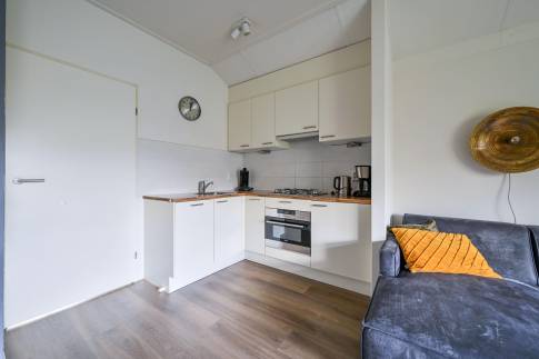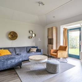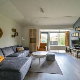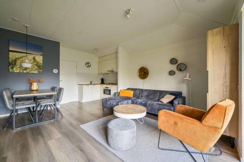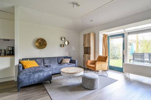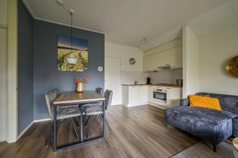 De lichte woonkamer is sfeervol ingericht met een comfortabele zit- en eethoek en staat in directe verbinding met het terras. Hier kun je in alle rust buiten zitten, midden in de natuur. De open keuken is volledig uitgerust en beschikt onder andere over een vaatwasser, combimagnetron en Senseo-koffiezetapparaat.