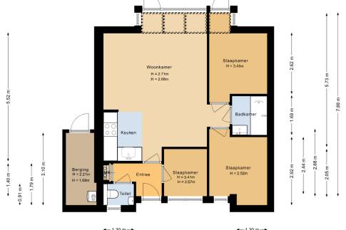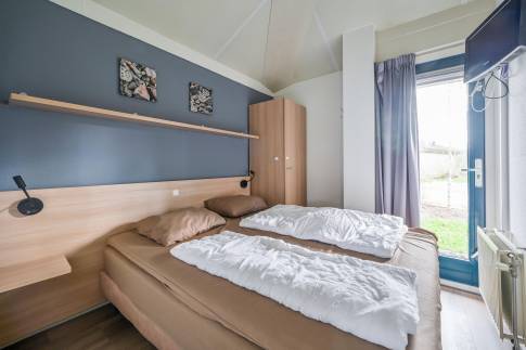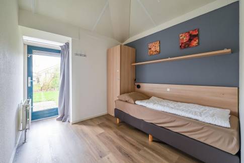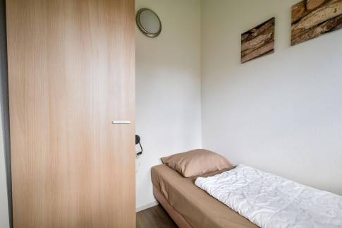 De woning heeft drie slaapkamers: één met twee eenpersoons boxsprings en twee met elk een eenpersoonsbed. Hierdoor kunnen gasten comfortabel verblijven. De badkamer is voorzien van een inloopdouche en wastafel, en het toilet bevindt zich separaat in de hal. Daarnaast is er een praktische externe berging aanwezig, ideaal voor fietsen en andere spullen.