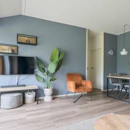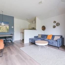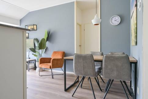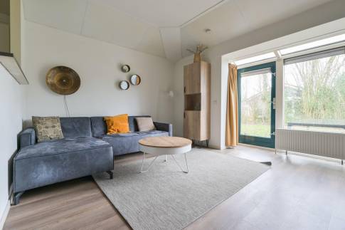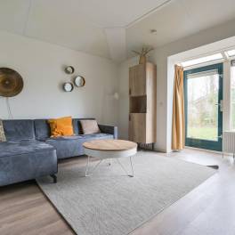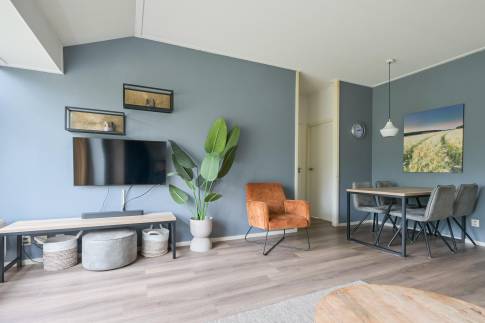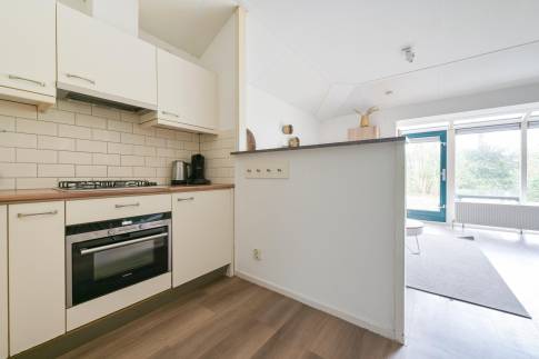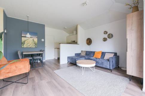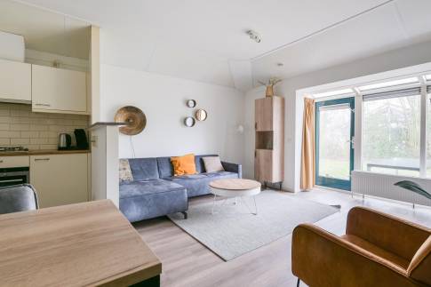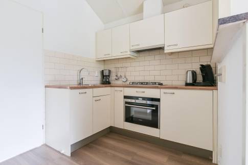 De lichte woonkamer is smaakvol ingericht met een comfortabele zit- en eethoek en grenst direct aan het terras. Hier ervaar je volop rust en zit je heerlijk buiten, omringd door natuur. De open keuken is volledig uitgerust en voorzien van onder andere een vaatwasser, combimagnetron en Senseo-koffiezetapparaat.