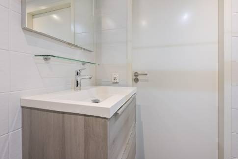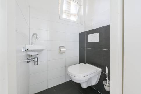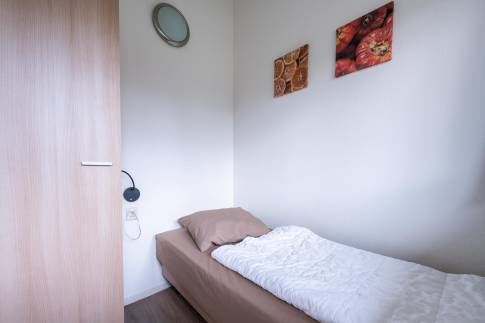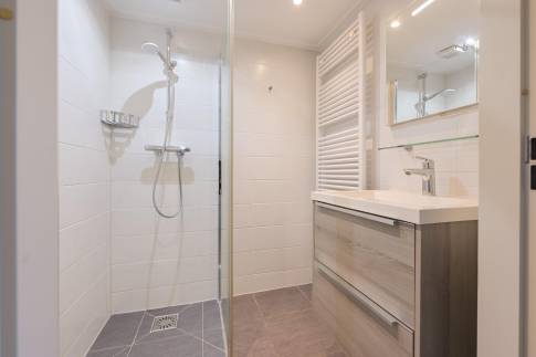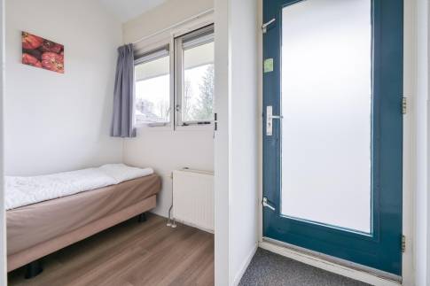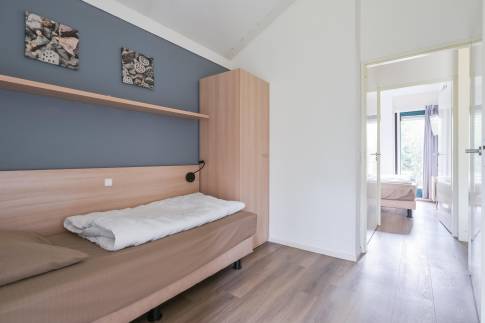 De woning beschikt over drie slaapkamers: één met twee eenpersoons boxsprings en twee met elk een eenpersoonsbed. Hierdoor kunnen gasten comfortabel verblijven. De badkamer is ingericht met een inloopdouche en wastafel, en het toilet is separaat gesitueerd in de hal. Daarnaast is er een praktische externe berging aanwezig, ideaal voor fietsen en overige spullen.