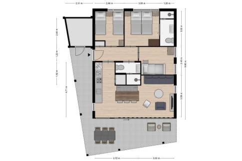 De vrijstaande, gelijkvloerse lodge is met een woonoppervlakte van 70 m² de grootste binnen het project. De master bedroom beschikt over 2 eenpersoonsbedden en heeft een badkamer ensuite met regendouche, toilet en wastafel. De overige 2 slaapkamers hebben elk 2 eenpersoonsbedden en delen samen een tweede badkamer. Een daarvan is de kinderkamer. Die herken je door het patrijspoortje dat als doorgang naar de woonkamer dient. Welk kind wordt daar nu niet vrolijk van? De keuken is voorzien van vaatwasser, koelkast, combimagnetron en een 4-pits inductiekookplaat. De mooie open living grenst aan een ruim terras, waar plek is om te eten en te loungen.