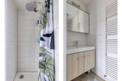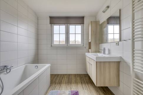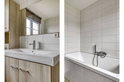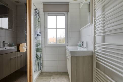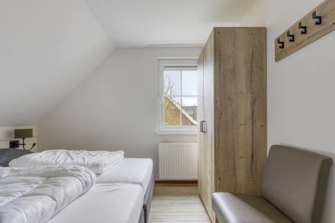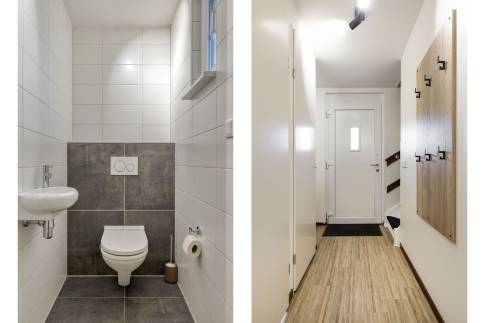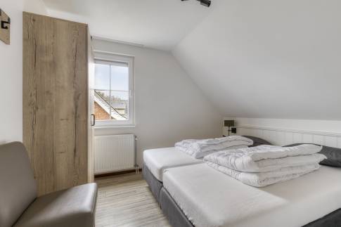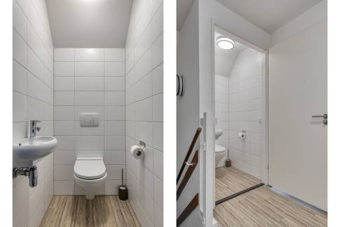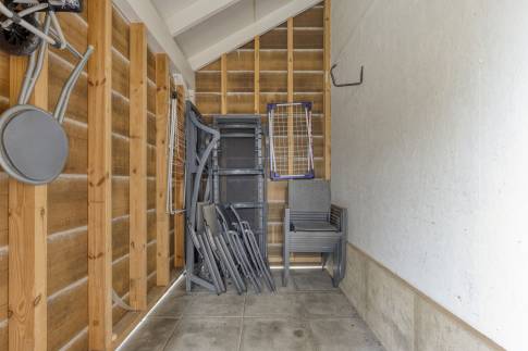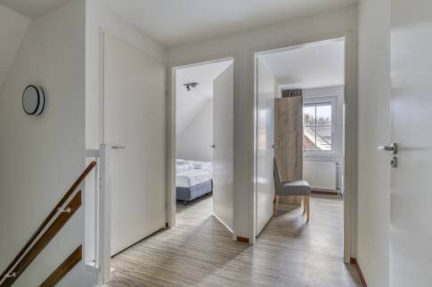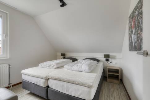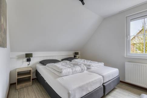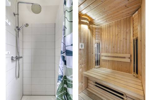 Op de begane grond bevindt zich een comfortabele slaapkamer met twee eenpersoonsbedden en een badkamer en suite. Op de verdieping zijn drie sfeervolle slaapkamers gesitueerd, elk ingericht met twee eenpersoonsbedden. De villa beschikt over twee badkamers: één met ligbad en één met douche en sauna, ideaal voor extra ontspanning. Zowel beneden als boven is bovendien een apart toilet aanwezig. In de praktische berging vind je daarnaast een wasmachine en droger.