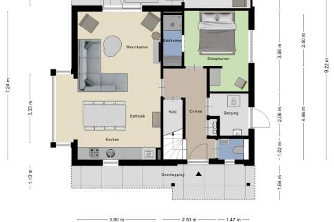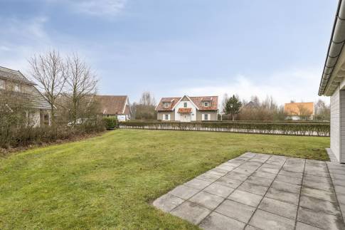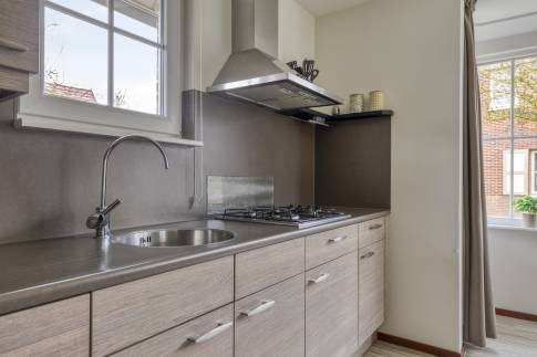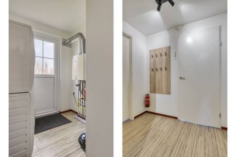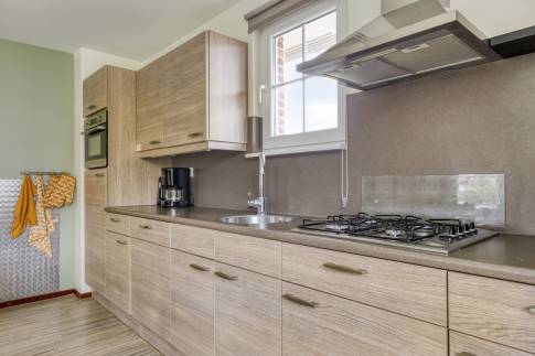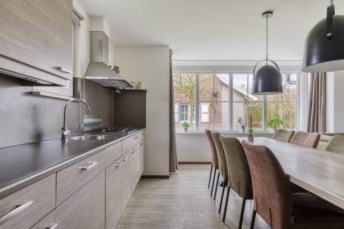 Via de entree kom je in de lichte woonkamer, waar grote raampartijen en openslaande deuren zorgen voor een prettige verbinding met het terras en de tuin. De moderne open keuken is voorzien van luxe inbouwapparatuur, waaronder een vaatwasser en een combimagnetron en biedt alle comfort voor uitgebreid koken en gezellig samenzijn.
