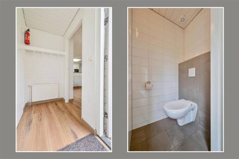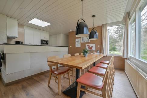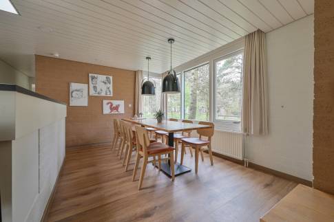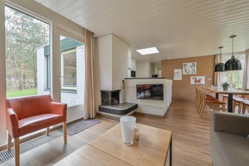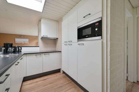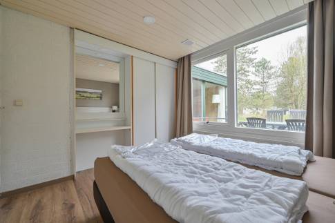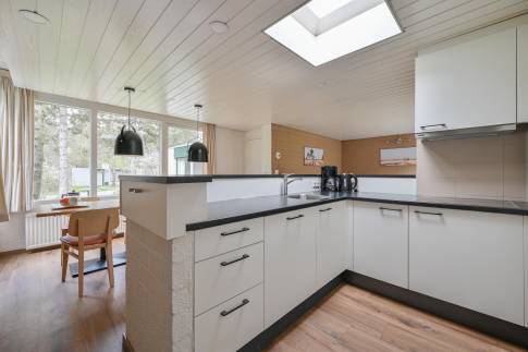 Deze recreatiewoning (type 8B) biedt plaats aan maximaal acht personen en is rustig gelegen aan de rand van het park, op een royaal perceel van 611m2 eigen grond. De open keuken is modern ingericht en voorzien van onder andere een vaatwasser, combimagnetron en koelkast met vriesgedeelte. De woonkamer is licht en geeft toegang tot het terras met tuinmeubilair, waar je tijdens mooie dagen heerlijk buiten kunt zitten.